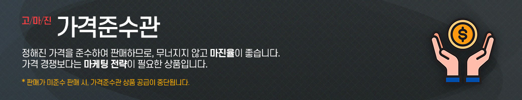 유의사항 '소비자가 준수상품'들은 소비자가(정가)를 준수하여 판매해야 하는 상품들입니다. 주기적인 온라인 판매가 스캐닝이 이루어지고 있으며,미준수된 가격으로 판매 중 적발될 시 상품 공급이 중단됨은 물론, 사이트 이용 불가 등 불이익이 발생할 수 있으니 유의해 주시기 바랍니다. |